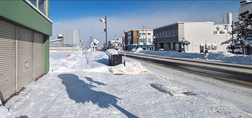 上の写真は「いわた書店」の前から撮りました。国道無電柱化ですっきりしているのが分かります。いわた書店の隣りが「すないる」ですが、小山酒店からいわた書店まではキレイに歩道全部が除雪されています。