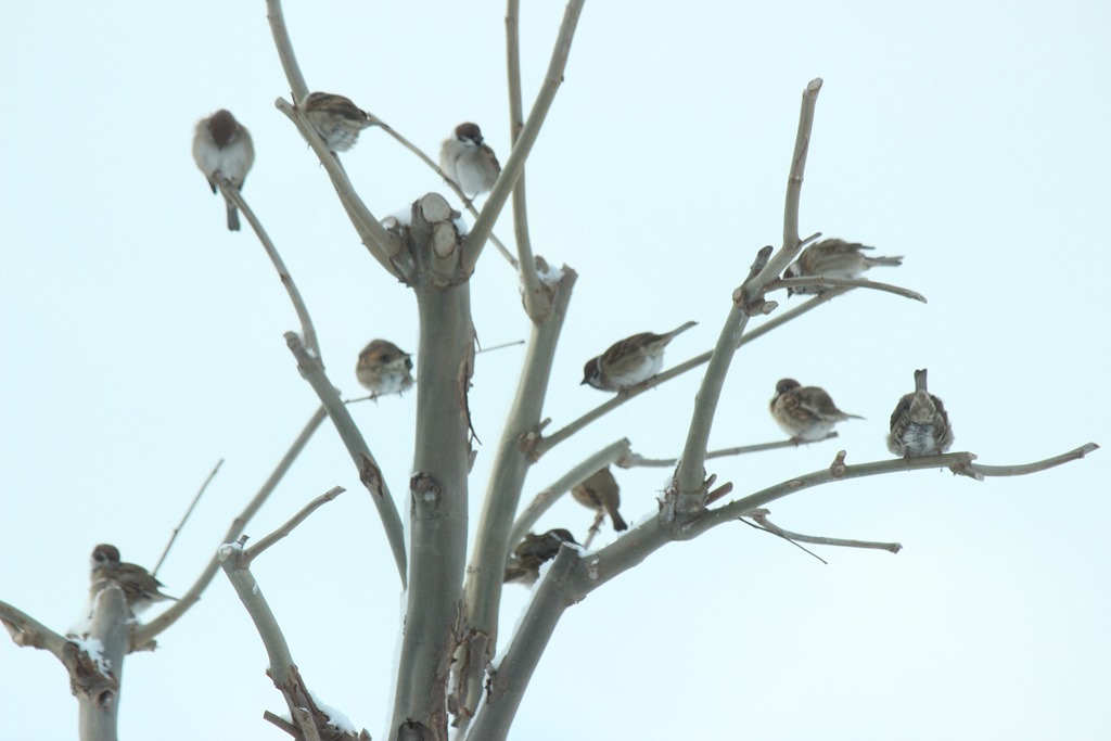 まず、スズメです。木にスズメが生っているようで美味しそう。餌は農家からいただいたお米と量販店で買って来たヒマワリの種です。