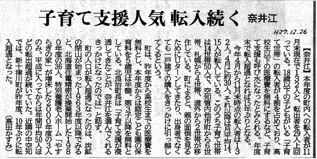 上の写真は昨年末に道新空知版に掲載された記事です。奈井江町の平成27年度(まだ途中ですが)の転入者が132人と、転出者を29人上回っているとの内容でした。
