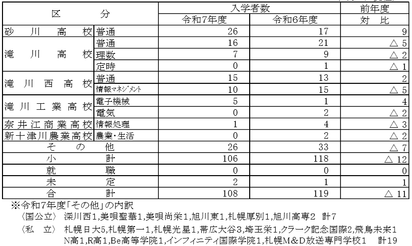 私が気になるのは、「その他」の26人です。卒業生の24.5%が空知北学区を出て高校に通うことになりました。