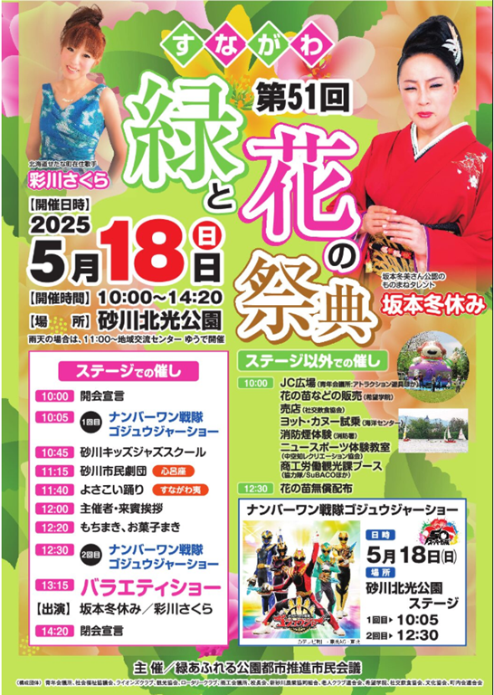 主催は「緑あふれる公園都市推進市民会議」で一般社団法人砂川青年会議所・砂川市社会福祉協議会・砂川ライオンズクラブ・砂川観光協会・砂川ロータリークラブ・砂川商工会議所・砂川市校長会・新砂川農業協同組合・砂川市老人クラブ連合会・砂川希望学院・砂川社交飲食協会・砂川市文化協会・砂川市町内会連合会の13団体で構成される「皆の祭典」。