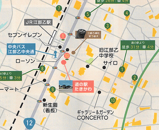 上のイラストは「道の駅たきかわ」の案内所で貰ったパンフレットの一部です。私が回った限りでは①が見どころでした。