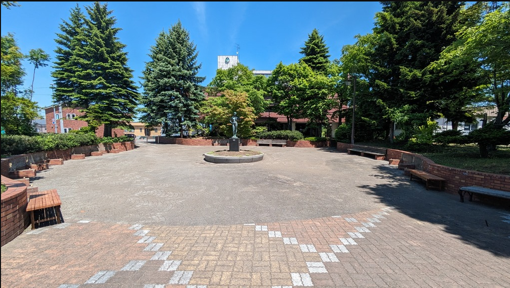この広場は上の写真でも分かる通り、駅とパークホテルの中間にあります。パークホテルはシロが所有し、ホテルのリニューアル中。