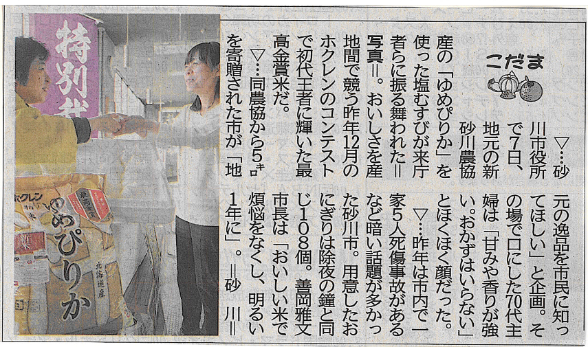 こちらは、同じく今朝の道新の記事ですが、小さいけれど全道版でした。記事中、昨年は暗い話題が多かった砂川市、今年は明るい1年にとありますが、その通りです。