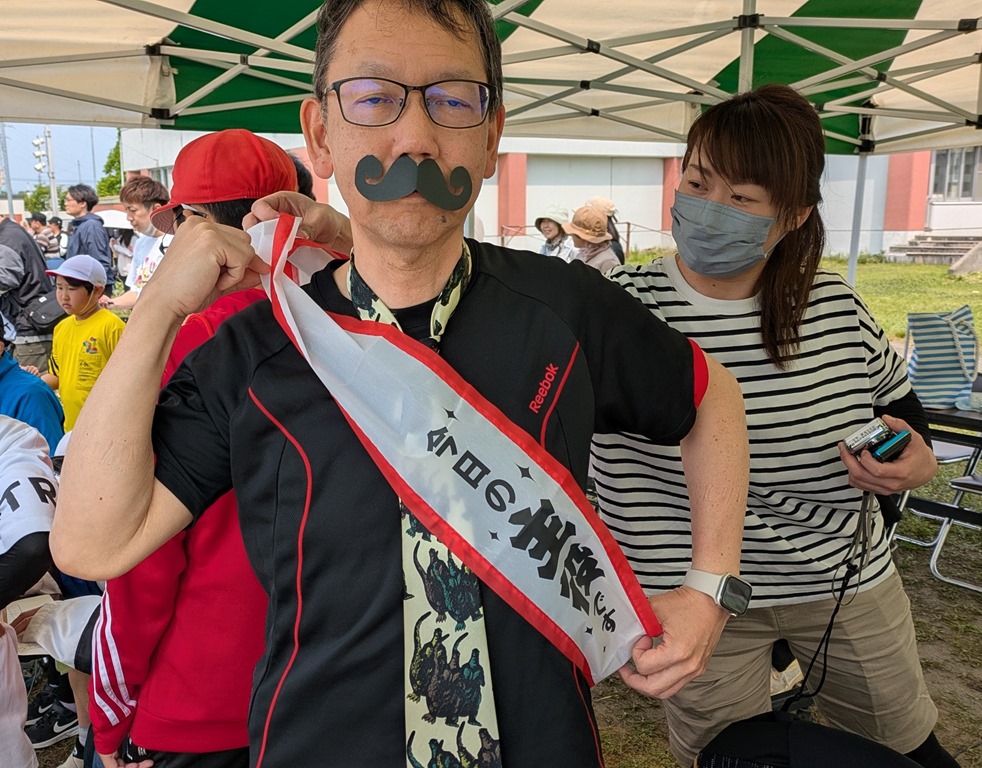 プログラムの中に「閉校準備委員会」と名付けられた1.2年生の種目があり、閉校準備には片付けてゴミも出るし、偉い人も来るだろうと借り物競争のような競技でした。偉い人役は角銅校長と岩渕PTA会長で、上の右の写真は本部席で準備中の校長先生です。