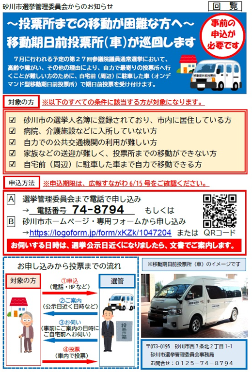 ちょっと長い題になりました。7月20日が最有力候補日となっている参院選挙に、全国的にも珍しい事前予約型の車両による期日前投票所の予約が始まりました。