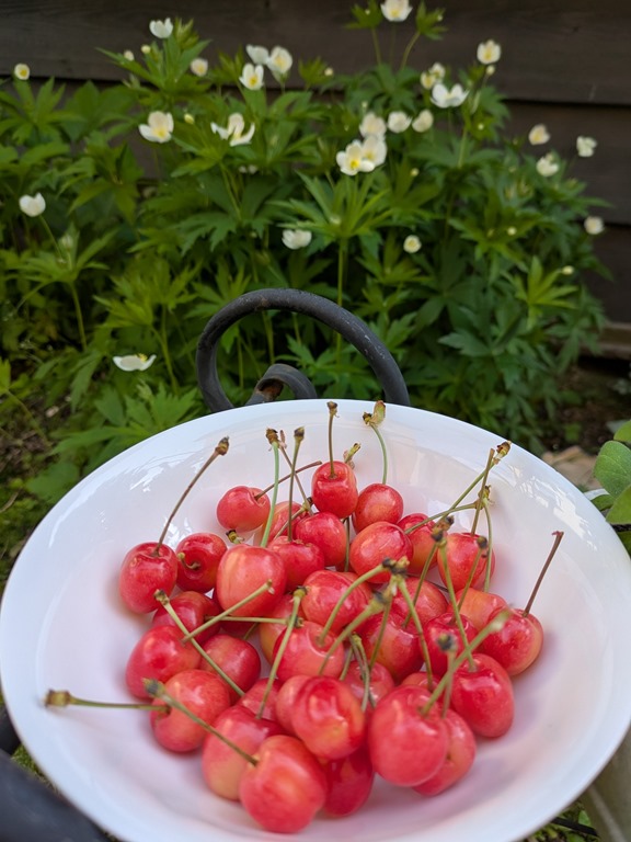 我が家のサクランボを慌てて収穫しました。少し色づき始めたと思っているとカラスが狙っています。そこで、大慌てで紐を張ったのですが、ヒヨドリが紐など関係なく食べに来ました。