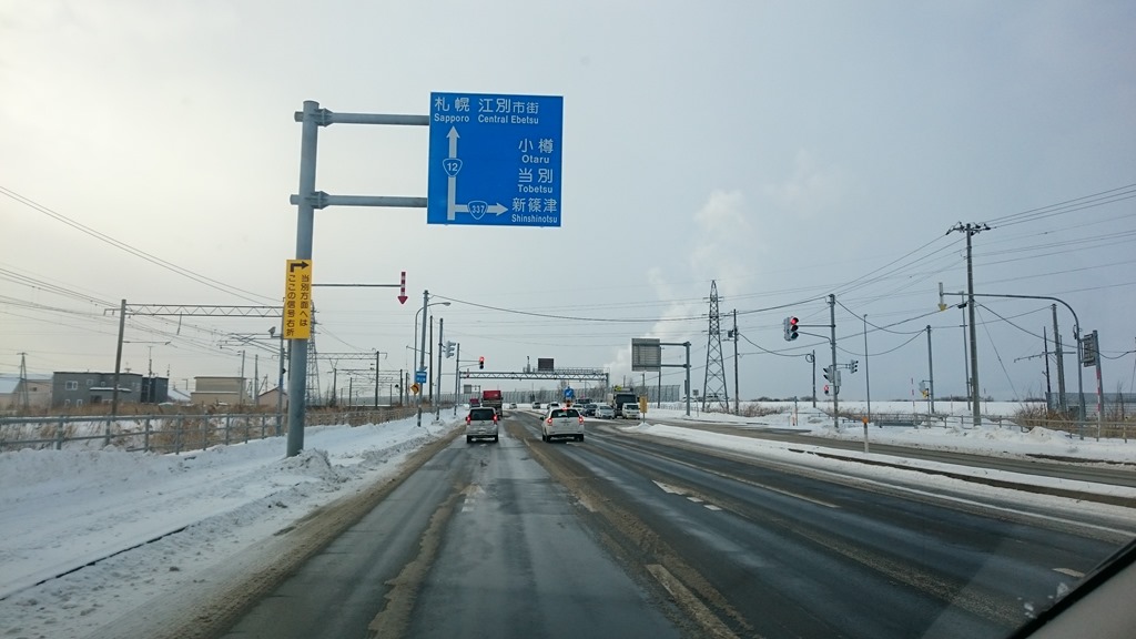 上の写真は江別市の市街に入る前ですが、ご覧のようにアスファルトが出ています。実はお昼過ぎに砂川を出ましたが、激しい雪が降っていました。その後、美唄を過ぎるまでは、前方が見えなくなるホワイトアウトに会いながら慎重に運転しました。