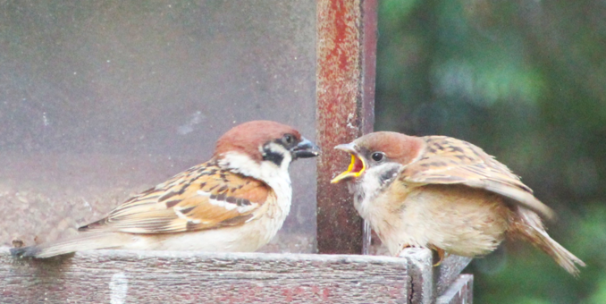 上の写真は今朝です。我が家のエサ台にほぼ同じ大きさのスズメがやって来ますが、羽を震わせ、エサをねだっている様子。望遠で撮ると「クチバシが黄色」でした。