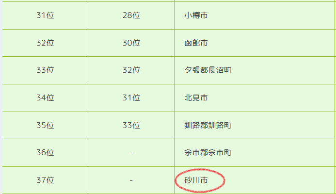 表の最下位37位でしたが、砂川市が入っているではありませんか。なんか嬉しくなりました。