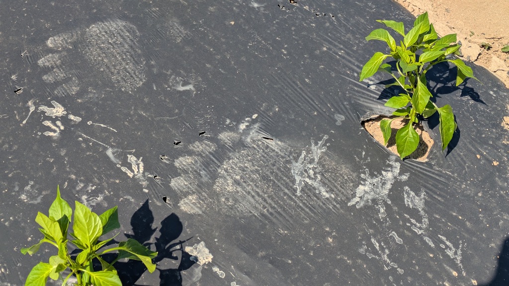 上の写真はマルチの上に付いたクマの足跡です。今朝、このそばにあるトウモロコシが食べられていたそうです。