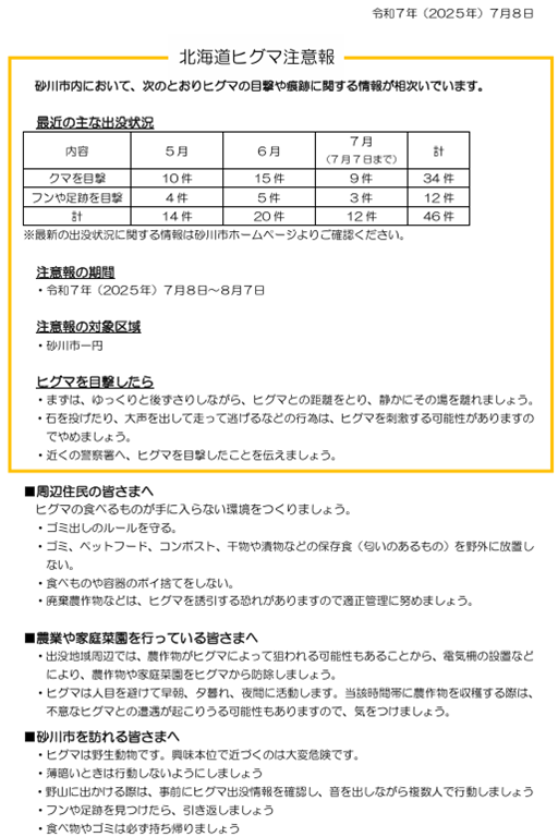 現在、北海道から砂川市内全域に「ヒグマ注意報」が出されています。