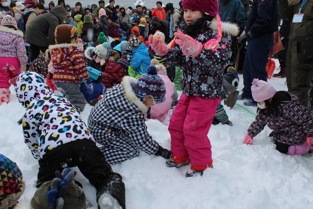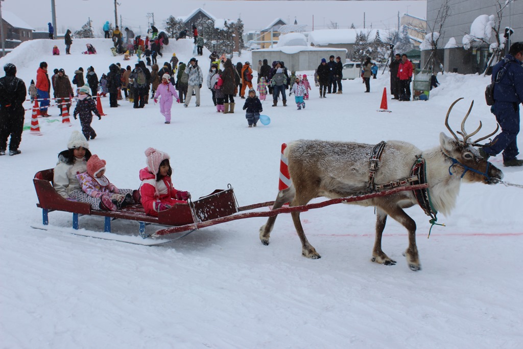 上の写真は子ども達に人気の雪山すべり台とトナカイのそり体験、そして、子ども宝さがしゲームです。