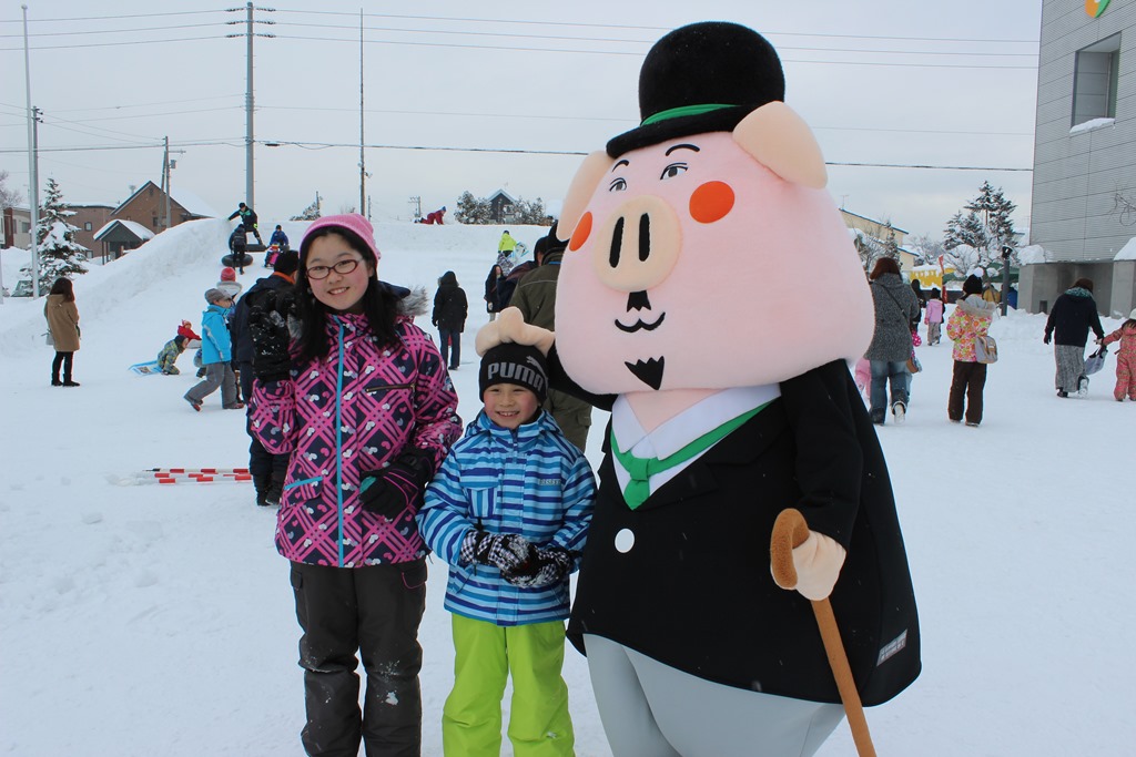 左は「ジャリンパ(赤ジャリ、青ジャリ)」、続いて真ん中は「みまもりんご」、そして、子ども達と記念撮影をする「ポークチャップリン」です。