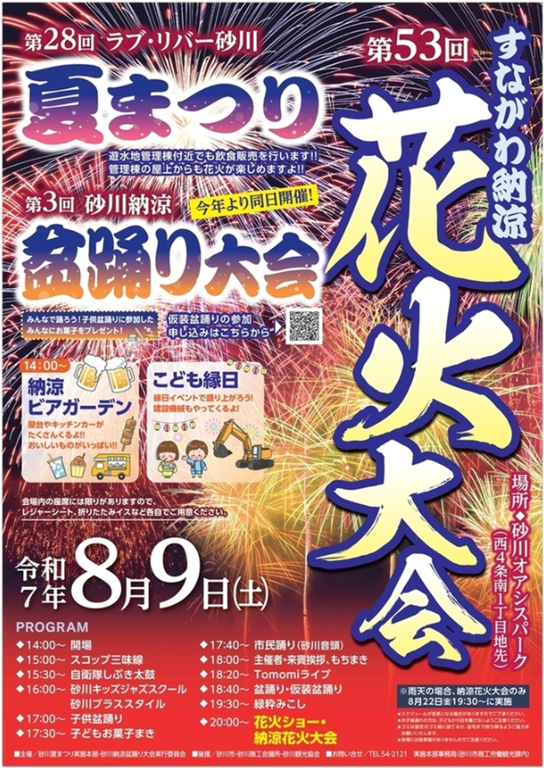 「第53回すながわ納涼花火大会」、「第28回ラブ・リバー砂川夏まつり」、「第3回砂川納涼盆踊り大会」が合わせて一緒に参加できます。
