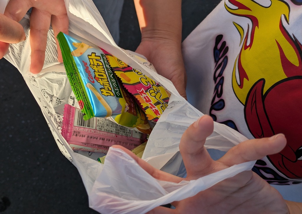 左の写真は子ども盆踊りの後に配られたお菓子(600個準備したそうですが、足りなかったのでは)。そして、右の写真は宮川団地跡地の土地販売を宣伝する市の職員。(詳しくは「宮川団地跡地を販売します」にリンク)