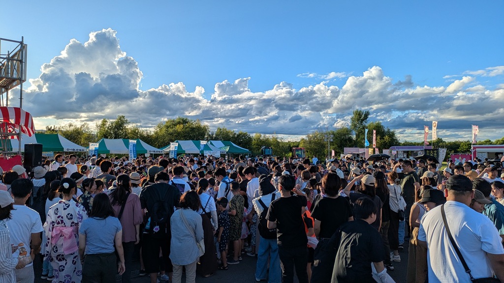 上の写真は午後5時ごろの会場全体ですが、すでにかなりの人出。花火大会が近付くにしたがって凄いことになっていきました。