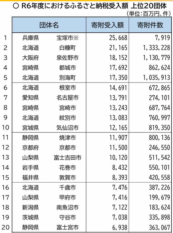 金額の単位が「百万円」ですから1位の宝塚市は256億6、600万円と読みます。宝塚市の※マークに「ふるさと納税額の約257億円には市立病院に対する市民2人からの約254億円の寄附が含まれている」と書いてあります。