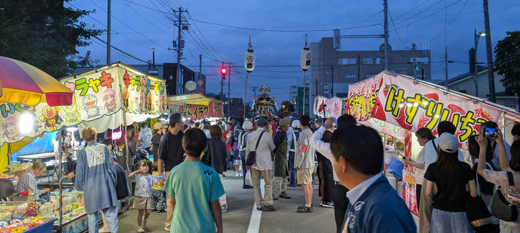 さすがに「本祭り」、やはり露店は夜が似合います。遠くから神輿がやって来ます。