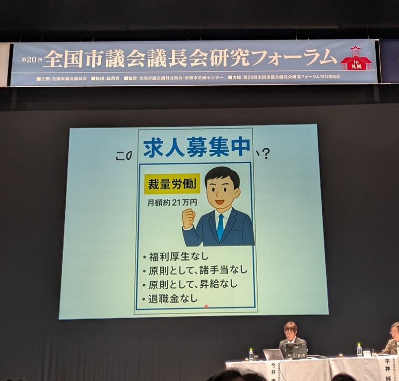 右の写真は今回で一番印象に残った、現在の市議会議員の置かれた立場を言い表していると思った物。求人募集は「議員のなり手募集」です。