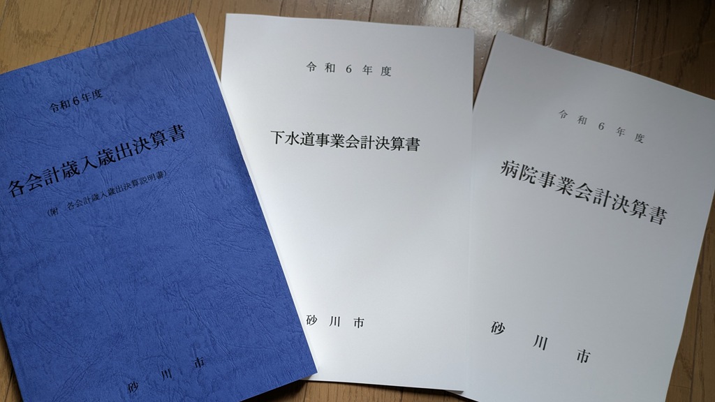 砂川市議会はデジタル化を完全実施していますので、久し振りに担当職員が自宅まで届けてくれたのは、令和6年度の決算書(上の写真)のみ。