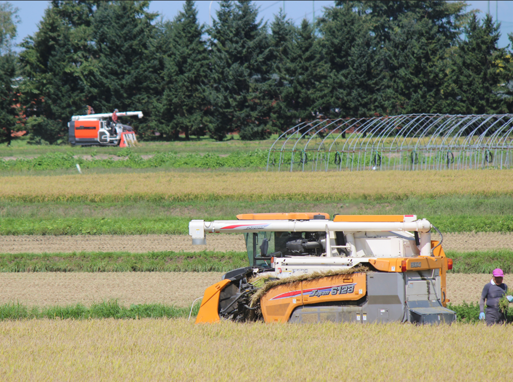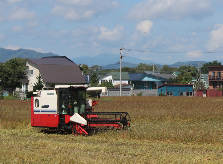 市内各地で収穫が始まっています。左は北光地区の稲刈りで、右の写真は東豊沼のソバの収穫。