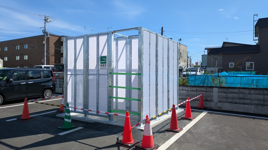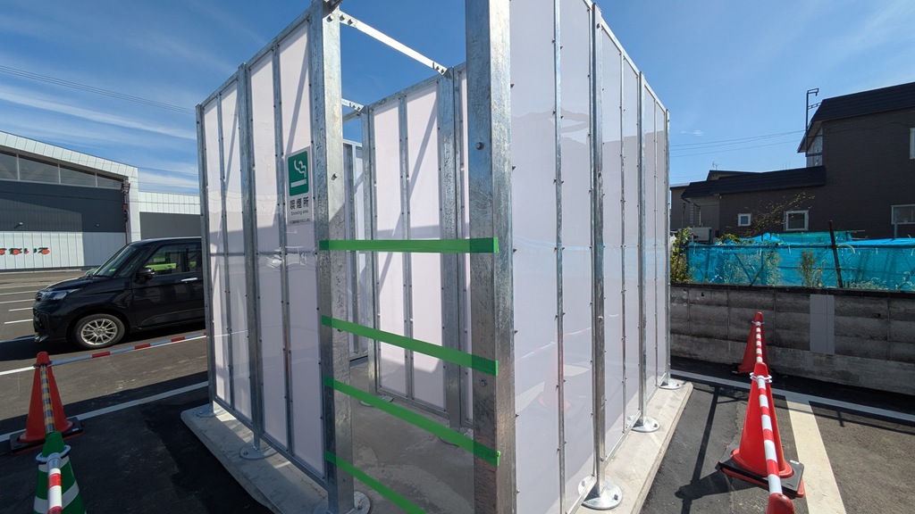 昨日ですが、議会終了後に「すないる」の駐車場で工事中でした「分煙施設」を見てきました。まだ、使えませんが、完成だと思います。(下の写真)