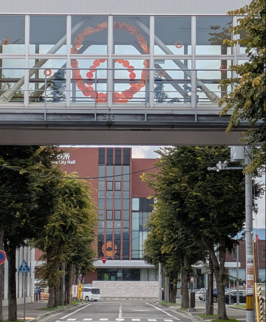 上の写真は市立病院の渡り廊下の「オレンジリング」です。先ほど紹介した奥の市役所のリングと同じ位置なのです。