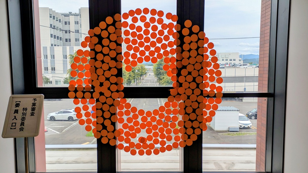 上の写真は9月議会初日の予算審査特別委員会が開かれた市役所2階大会議室横の窓ガラスです。『これは何だろう・・・?』。
