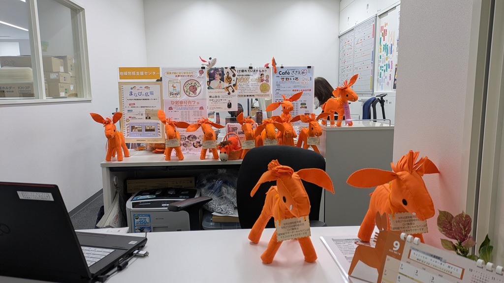 上の写真は市役所1階にある「地域包括支援センター」の窓口です。ここにはオレンジ色のロバがたくさんいました。