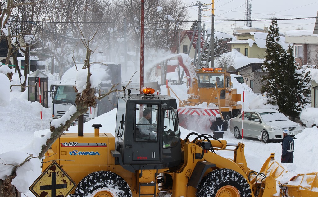 この排雪作業も高度な技術と熟練が必要です。大型機械を見事な技で操る動きは見ていても面白いですネ。一年間で除排雪に必要な費用は約2億4千万円(平成26年度決算)。冬期間の公共事業と呼ばれる所以です。