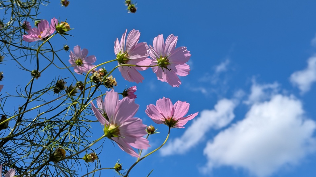 街回りの途中のコスモスは高い青い空に白い雲をバックに種が付き始めています。