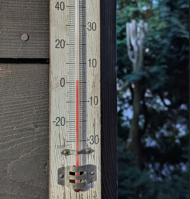 ヒィエーー!です。日が当たっているのですが、外の温度計はたったの「1℃」。天気が良く放射冷却でしょうか一気に冬になったようです。家のストーブ点けました。