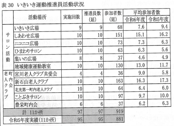 平成6年度の実績報告ですが、いきいき運動推進員は16人おられます。「ニコニコ広場」を含めて市内11ヵ所で活動されています。