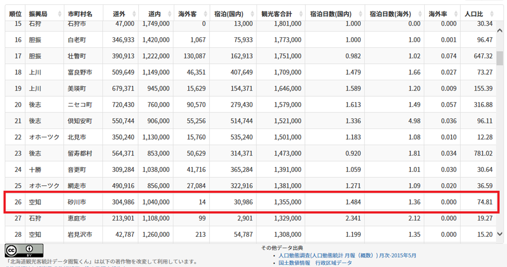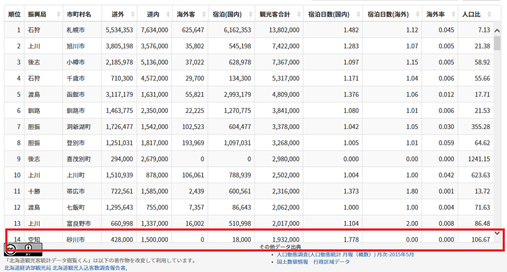 左は2007年、右は2014年のデータです。07年は砂川市の観光客入込数は193万2千人と道内でも14位にランクされているのが分かります。道内の著名な観光地と肩を並べる観光客数なのが凄い。