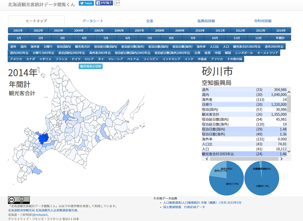 例えば、その活用例として下の写真のような「北海道観光客統計データ 閲覧くん」というサイトが紹介されています。