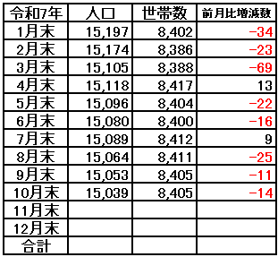 今年は昨年、一昨年と比較すると人口減少はやや少なくなっていますが、年内に1万5千人を切りそうなのが気になります。