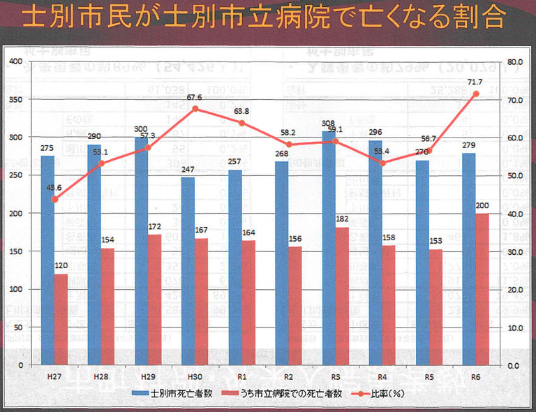 昨年度は士別市民が士別市立病院で亡くなられた割合が71.7%だったそうです。この数字を聞いて9月議会で私が行った一般質問を思い出しました。砂川市立病院での割合はどうだろう。