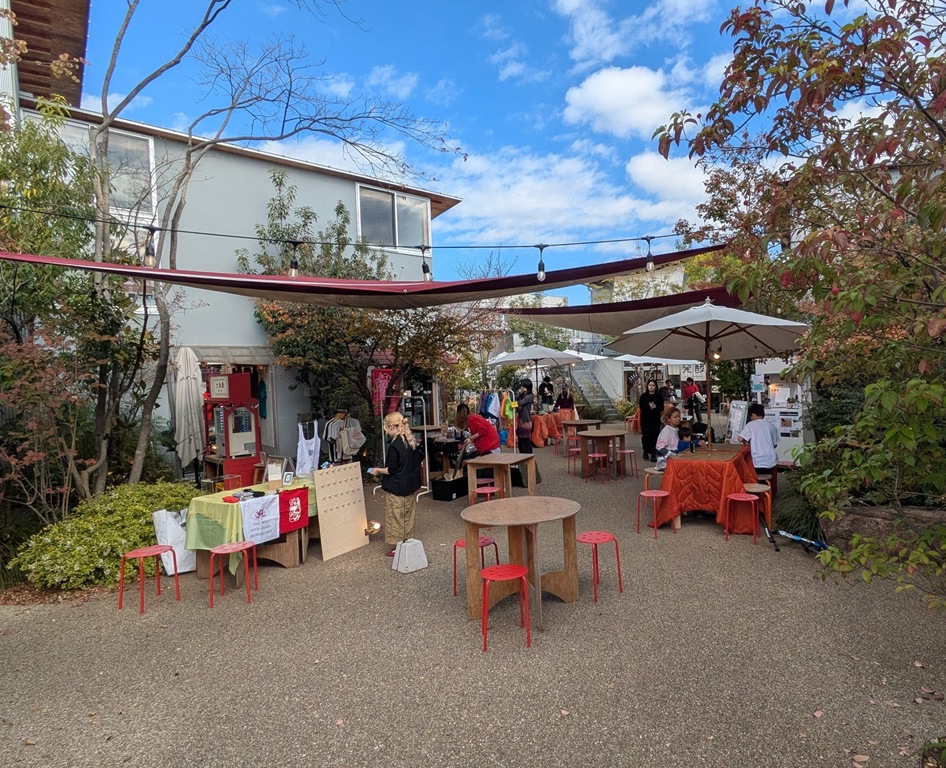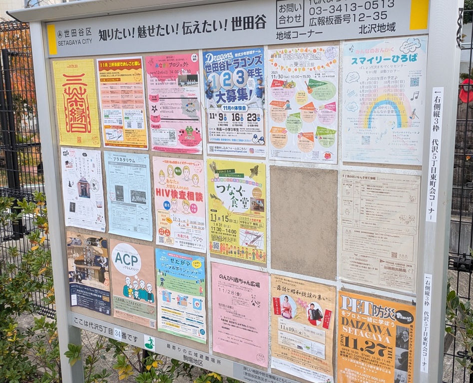 左は町内会の掲示板。所々にあって威力を発揮してそうです。右は小さな広場で、日常的にイベント開催状態。