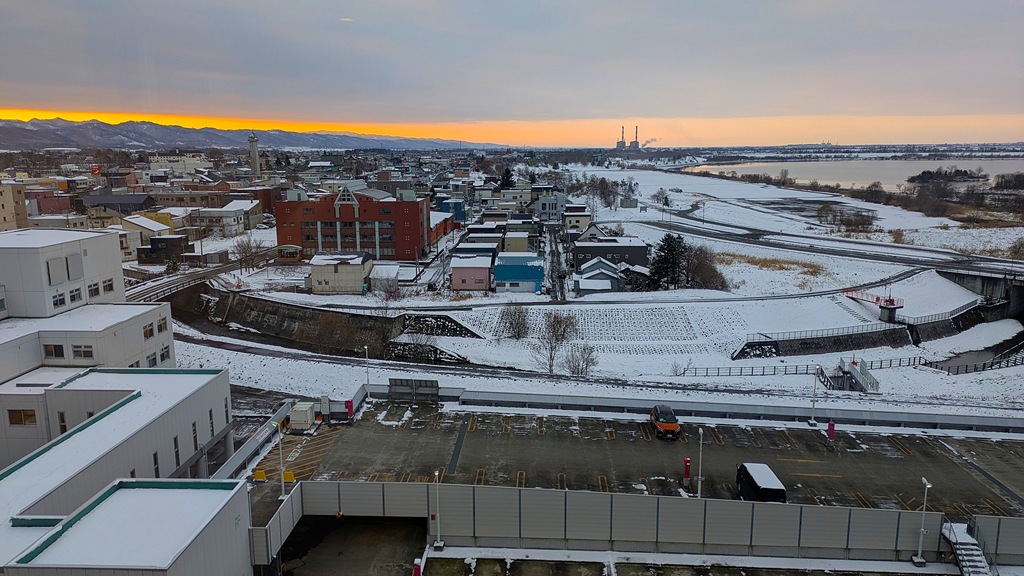 市立病院の7階から見た立体駐車場の屋上階です。昨日の午前6時34分。病院の朝は早く午前6時起床ですから一昨日降った雪をロードヒーティングが解かしているところです。こんなに早朝でも除雪をしている人がいます。