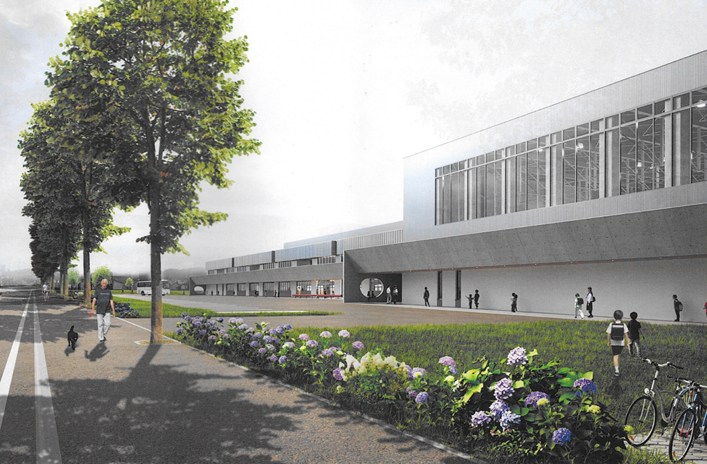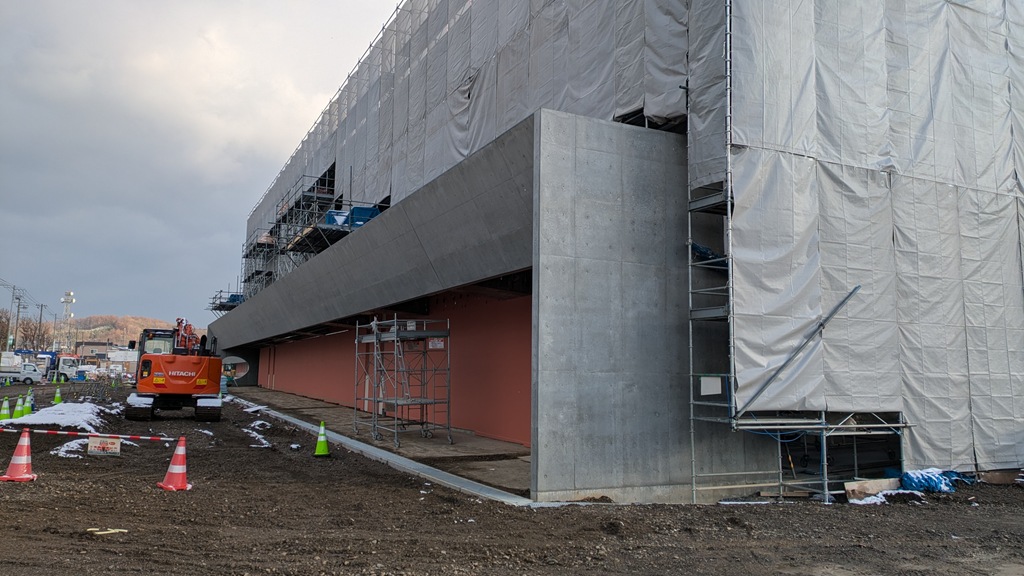 上から2枚目の写真でシートに覆われているのは体育館のようです。市のHPによると内部の工事も着々と進められているとのこと。