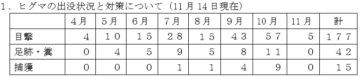 11月に入るとクマの出没はめっきり少なくなりました。目撃情報ですが、昨年は30件だったそうなので、今年の異常さが分かります。