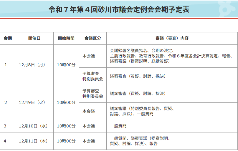 また、審議される議案については砂川市議会のHPに掲載されていますので「令和7年 第4回砂川市議会定例会議案」にリンクします。