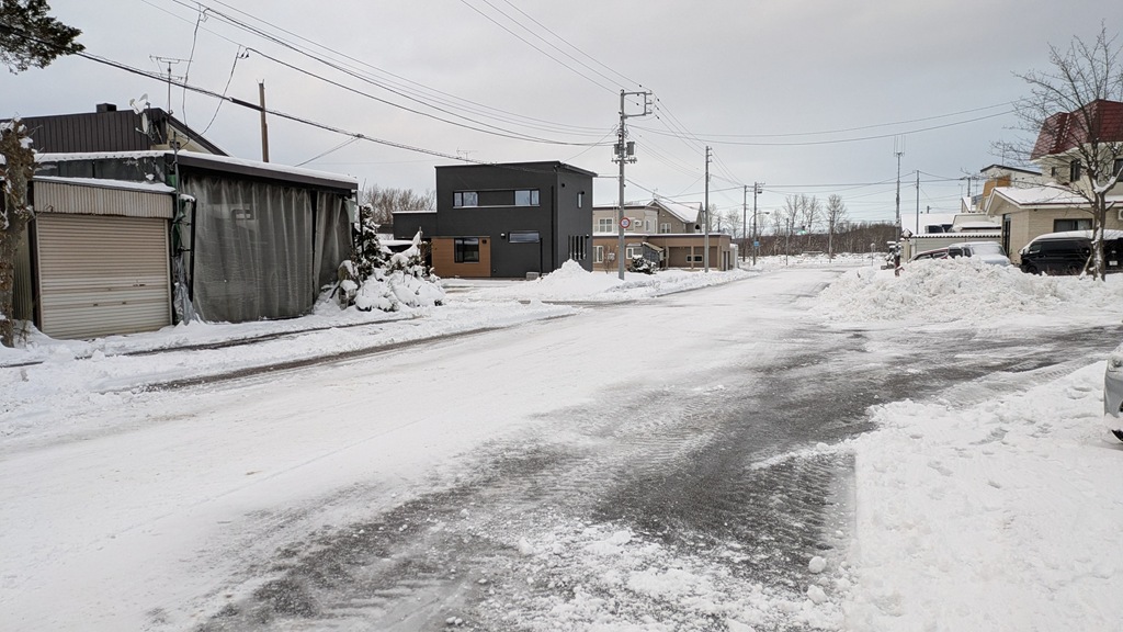 今シーズン初めての道路除雪が行われた昨日の朝は除雪車がキレイに雪を片付けてくれました。そして、今日は雪が解けてグチャグチャになっています。