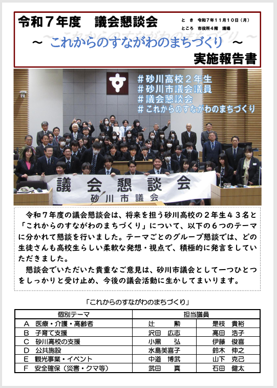 11月10日に砂川高校2年生43名と6グループに分かれて語り合った「議会懇談会」。