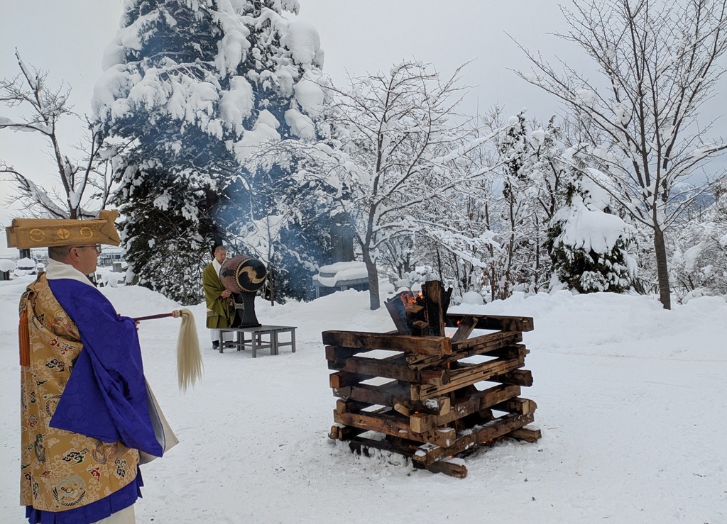 上の写真左は北泉岳寺の住職による大護摩。私も吉祥祈願をしていただきました。