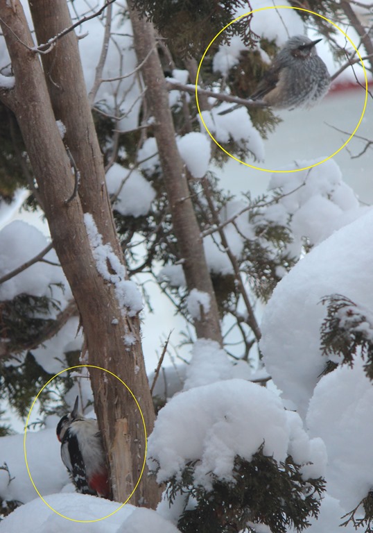 そして、上の写真ですが、ちょっと分かりづらいので丸いマークを付けましたが、上のヒヨドリが番兵役です。さすがに同じぐらいのアカゲラには手を出さず、お互いに意識しながら、しばらく動きが止まっている様子です。