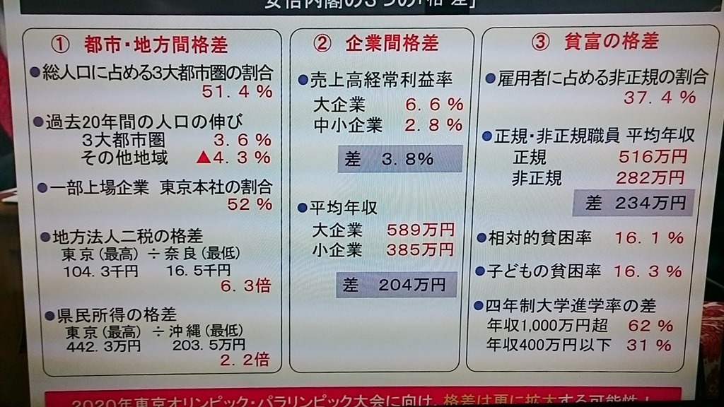 上の写真は、本日の予算委員会で、「おおさか維新の会」の質問の時に掲げられたパネルです。中央と地方の格差、企業間の格差、貧富の格差を端的に表していると思いUPしました。
