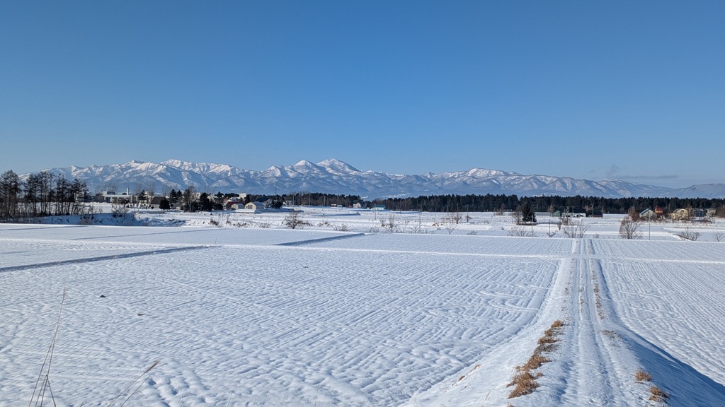 上の写真ですが、北光地区から見える樺戸連山。ピンネもキレイに見えています。雨の日が続いたりしたので、畦の草が見えています。12月の下旬でこの景色は珍しい。