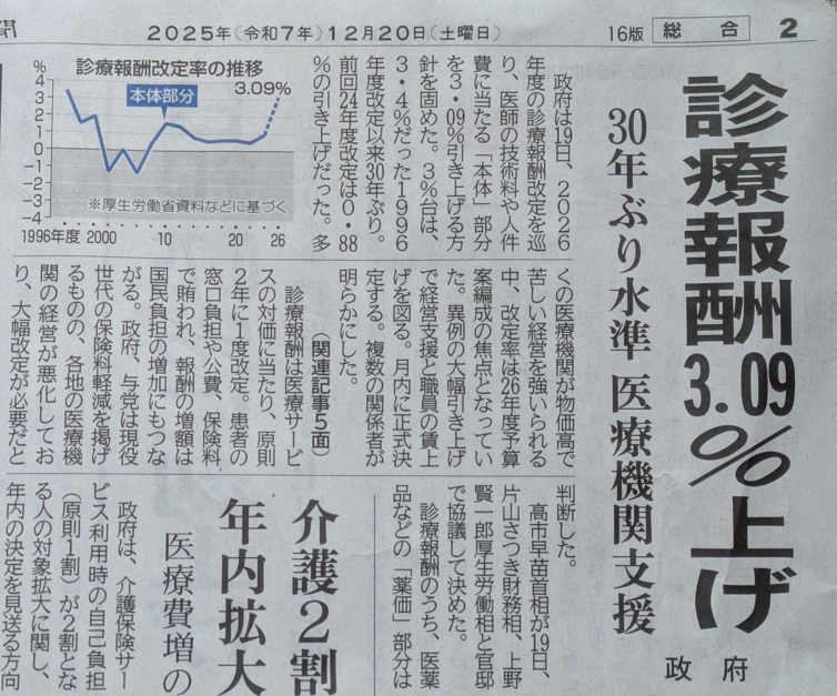 来年の診療報酬が3.09%上がるらしいです。